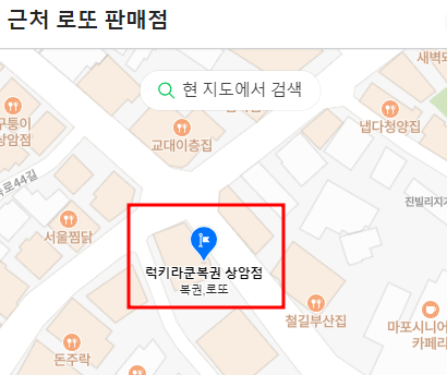 이렇게 검색하면 근처에 있는 모든 로또 복권 판매점이 지도에 나타나고 아래로는 주소와 길 찾기, 거리 등이 나타납니다.
