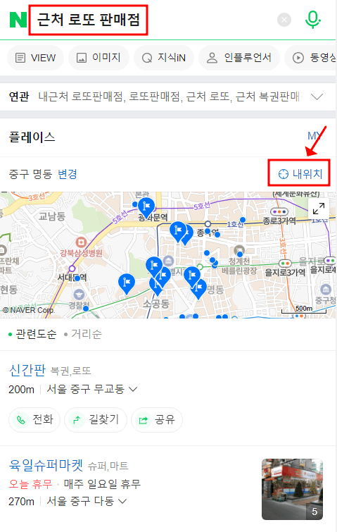 오른쪽 내 위치를 누르면 현재 내가 있는 곳 주변 근처 로또 판매점이 자동 검색되어 나타납니다.