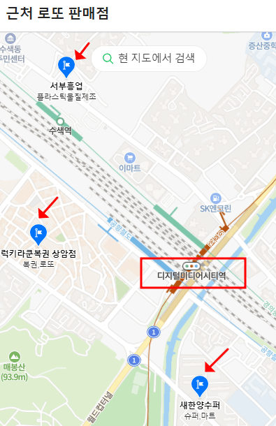 예시로 찾아본 디지털미디어시티역 근처 로또 판매점은 서부흥업, 럭키라쿤복권 상암점, 새한양수퍼 등 세 군데가 있네요.